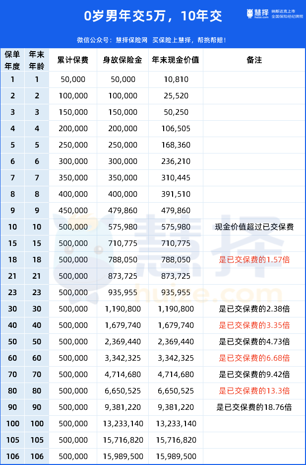 如果一次性投入50万有点困难,5年交/10年交(图2图3)的现金价值增长速度也很可观。
