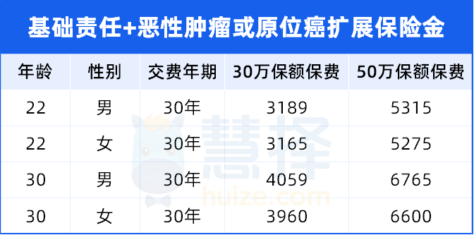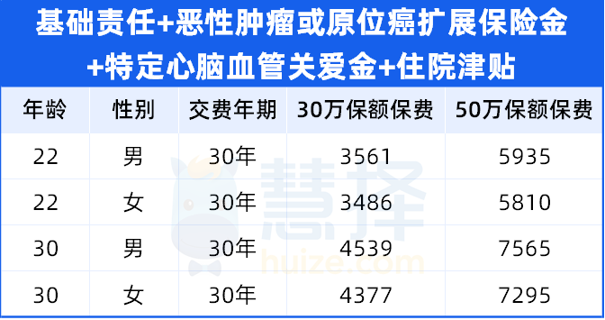 22/30岁投保,30年缴费,30万保额的年保费在3500-4500元左右,50万保额年保费在6000-7500元左右。