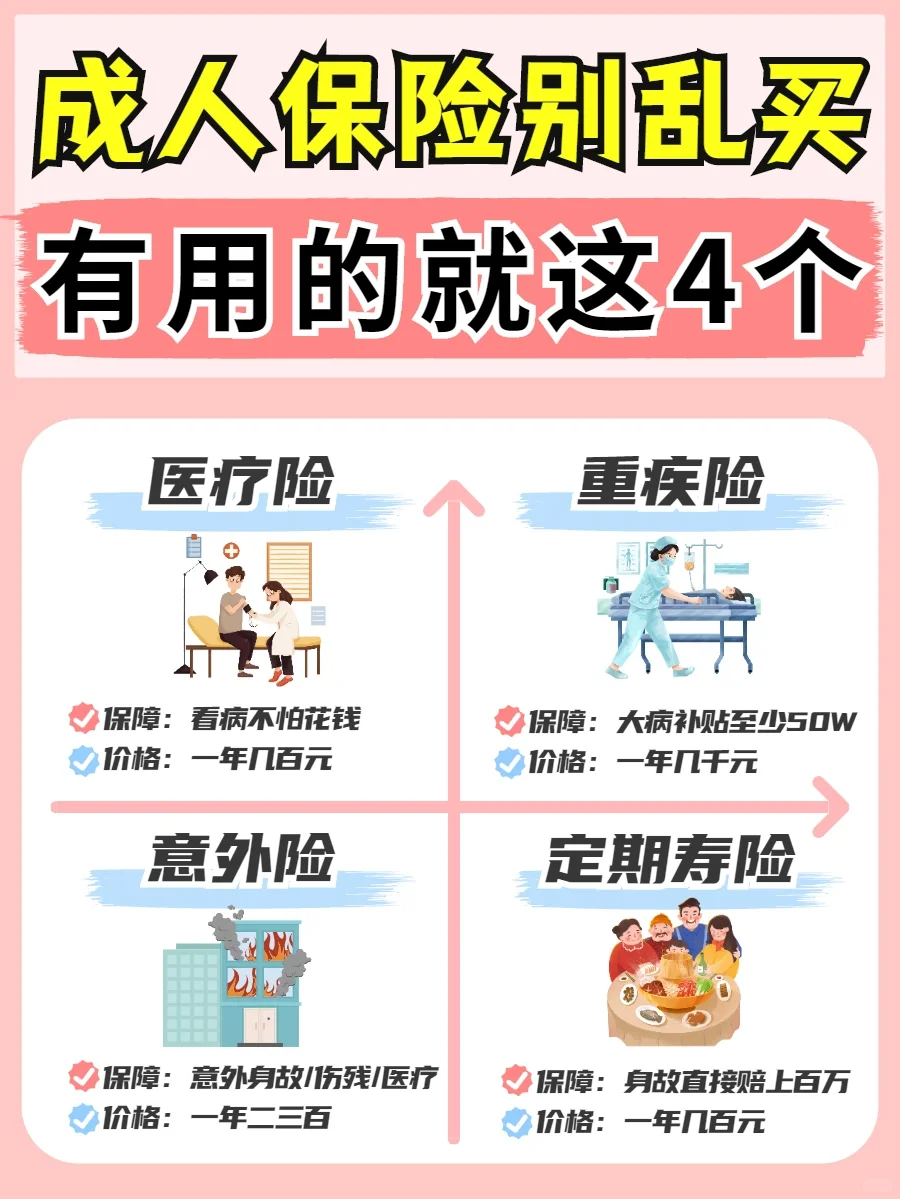 成年人买保险,最重要的其实是转移身故、疾病和意外风险。 真正有用的就这 4 种:重疾险 + 医疗险 + 意外险 + 寿险