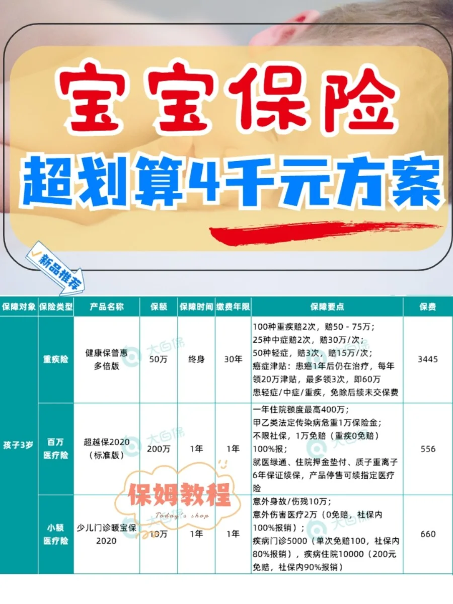 和医保相互补充,医保不报的都可以报,基本上按照这个配置思路,普通门诊也可以通过小额医疗险保险,1 年 4000 千左右就能把孩子的保险买齐了,而且保障还很齐全。