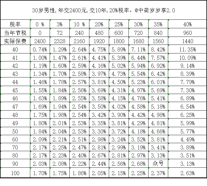 前十年,每年交2400元,3月退税480元,相当于只交了1960元.