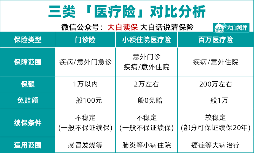 简单来说,百万医疗险是报销大病住院费用的;门诊险和小额住院险报销小病小痛医疗费。
