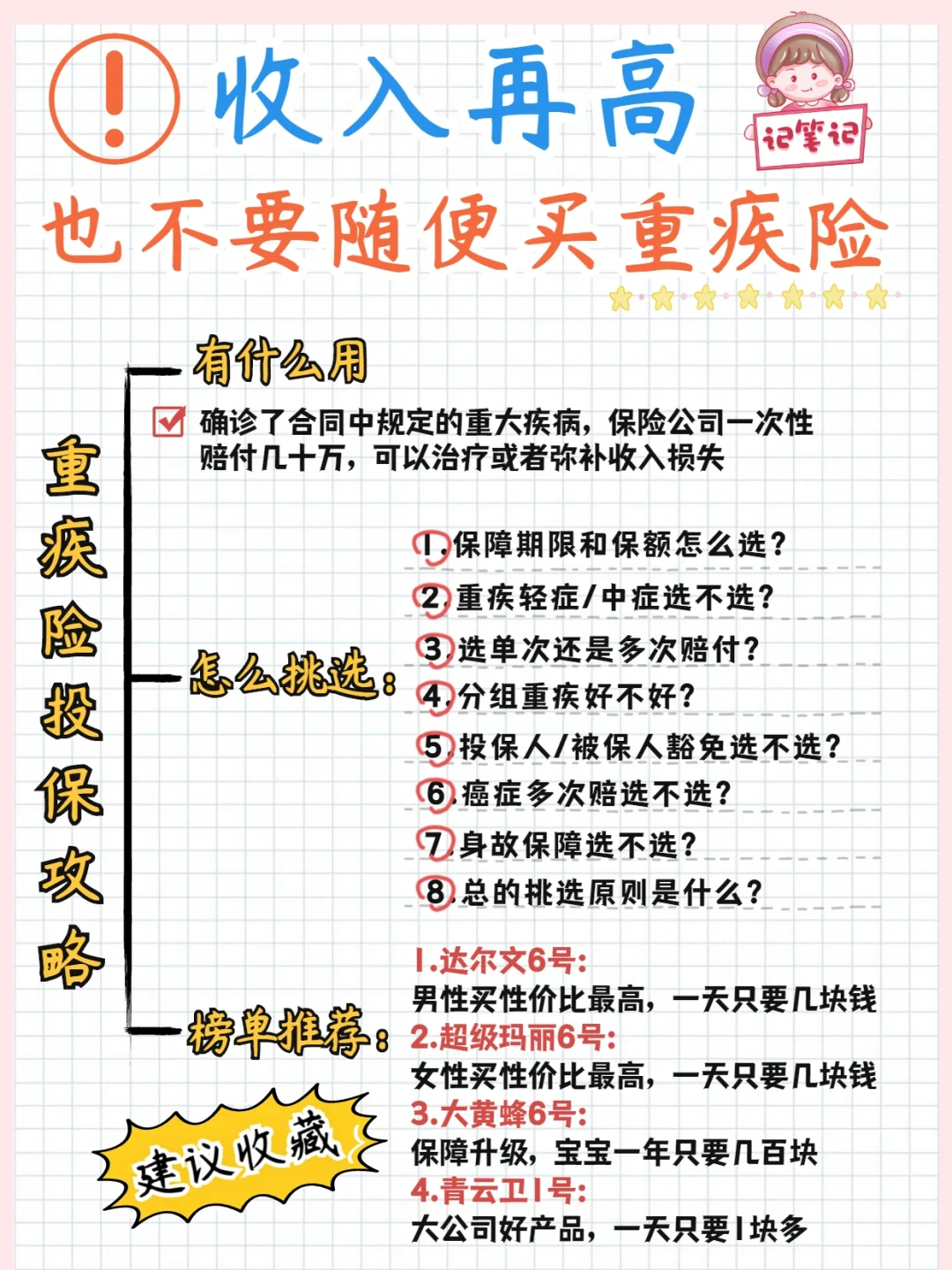 结合大白多年在行业里的摸爬滚打,给大家总结出来挑选重疾险不踩坑的技巧,记得收藏好,买之前拿出来看看。