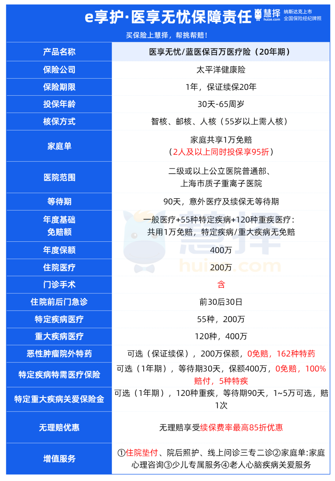 蓝医保百万医疗险是由太平洋大公司承保的一款百万医疗险,最大的亮点在于:
