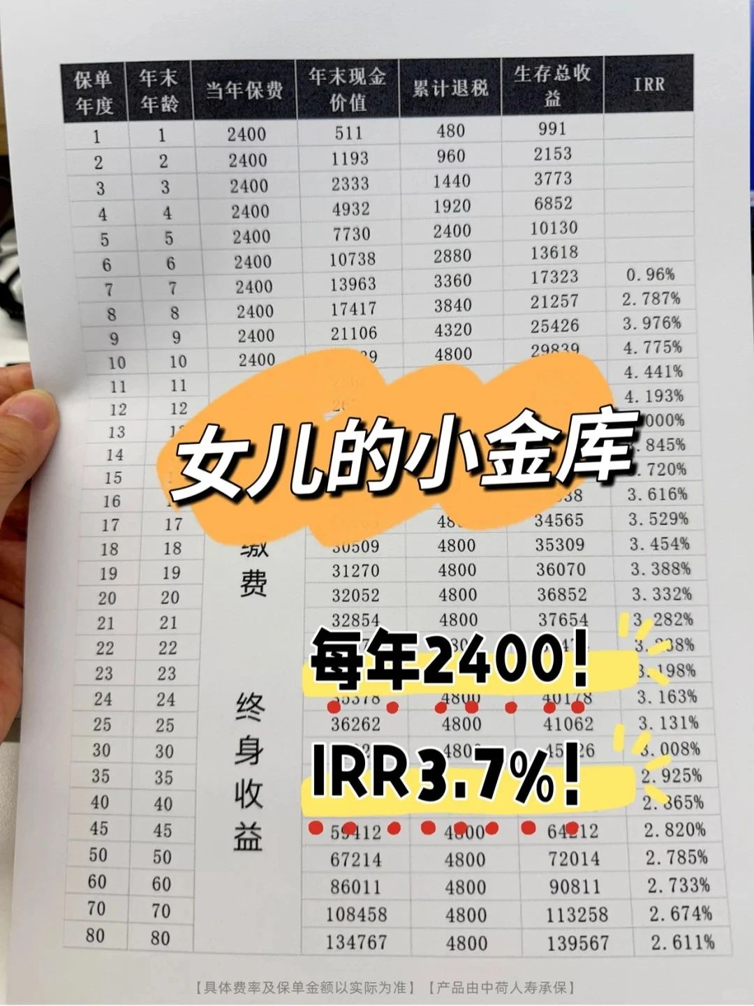 每年只用交2400,交10年(至少女儿18岁前,每年都有这么一笔固定的压岁钱收入哈哈)