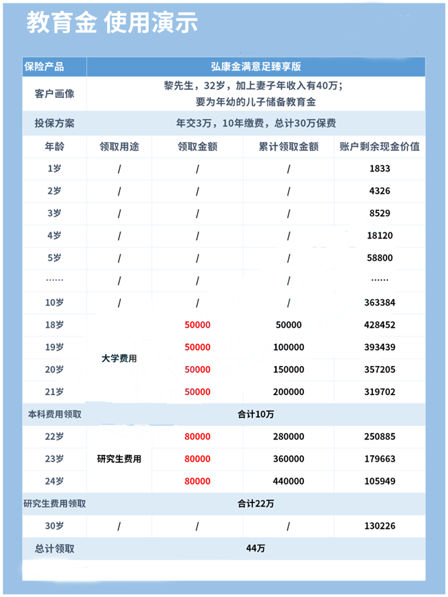 累计领取 44 万作为教育费用,账户中还有约 10 万现金价值,增值至小黎 30 岁时达 13 万元。