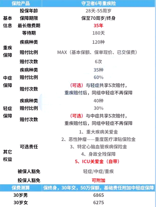 守卫者 6 号重疾险以其 6 次赔付的重疾保障和自带 ICU 关爱金等特点,成为一款备受欢迎的重疾险产品。