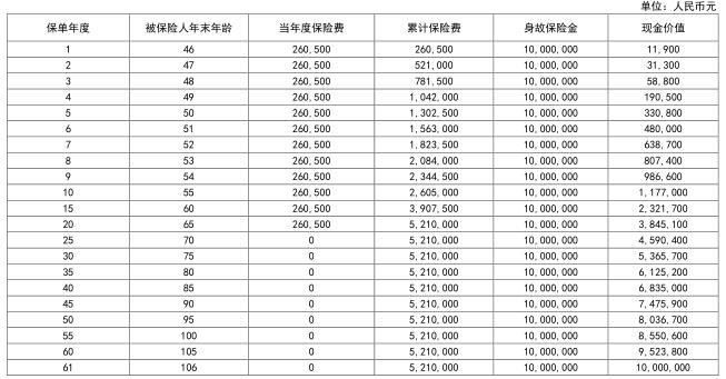 45 岁男性投保 1000 万元,20 年交费,年交保费 260500 元,杠杆率显著。