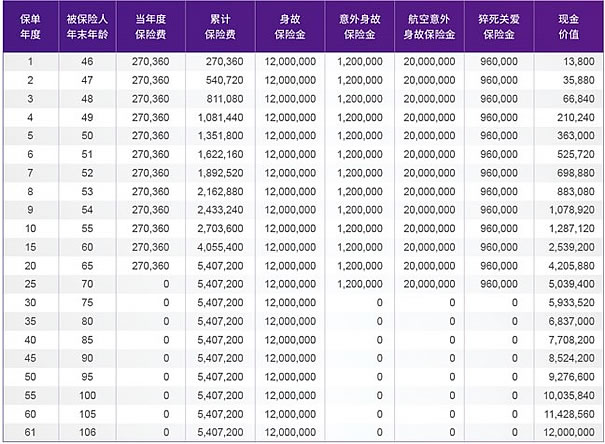 航空意外身故保险金:71 周岁前航空意外身故,额外赔付 10%+200% 保额,最高不超过 2000 万。
