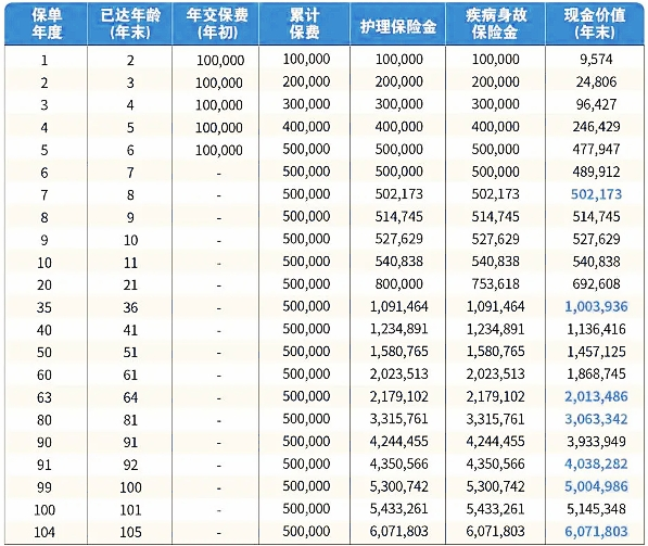 李女士,30 岁,为 1 岁女儿投保,选择年交保费 10 万元,交费期 5 年,基本保险金额为 471409 元,享受终身保障。