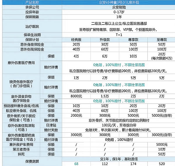 众安 i 小神童 3 号少儿意外险,为出生满 30 天至 18 周岁的孩子们提供全面保障。这款产品以其 0 免赔、100% 赔付比例、不限社保范围的优势,以及 68 元起的亲民价格,成为家长的优选。