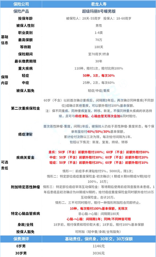 总结:君龙超级玛丽 8 号暖男版以其更灵活的理赔方式、更宽松的理赔规则和可附加的投保人豁免,成为比 7 号暖男版更划算的选择。价格相同的情况下,8 号暖男版提供了更容易获得理赔的保障,特别适合有特定疾病家族史或为家人投保的消费者。在选择时,建议优先考虑 8 号暖男版以获得更全面的保障。