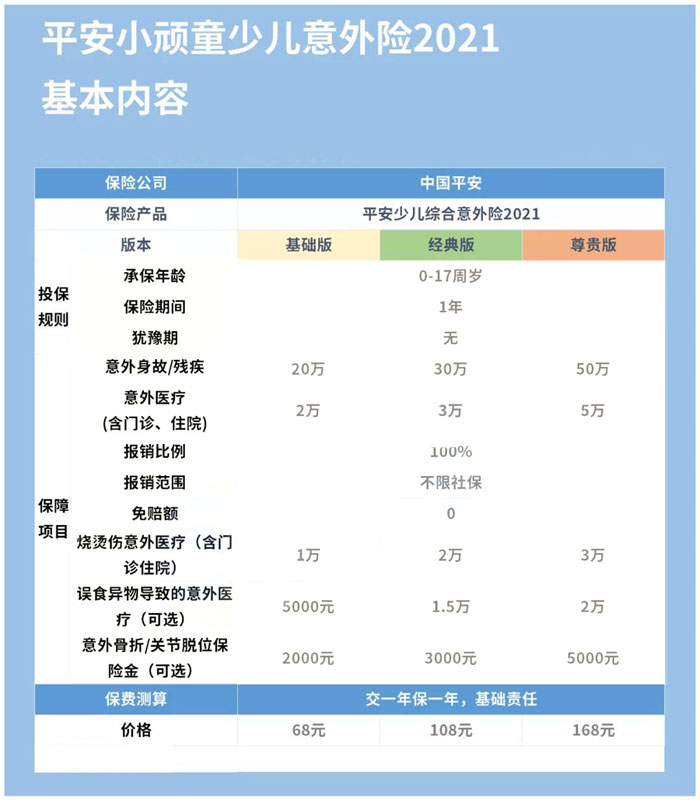 平安小顽童少儿意外险 2021 提供三个版本,满足不同家庭的需求: