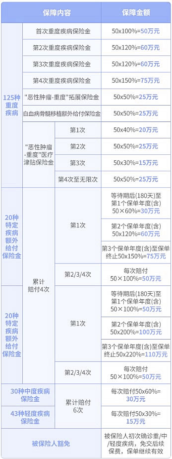 125 种重度疾病(含 20 种特定疾病和 20 种罕见疾病),最高赔付 4 次;