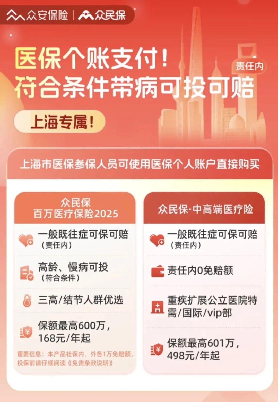 众安众民保中高端医疗保险和众民保百万医疗2025上线医保个账支付版,目前已正式支持上海医保个人账户支付!