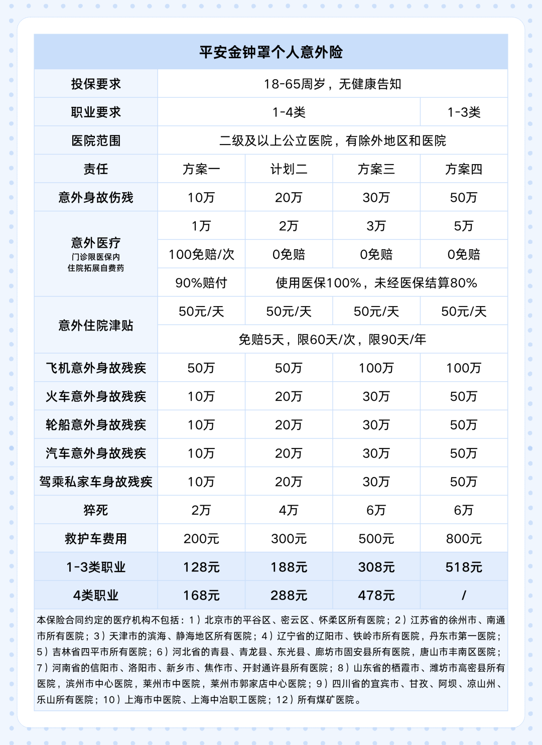 平安金钟罩个人意外险18-65岁都能买,承保1-4类职业,没有健康告知限制,只要可以正常生活或者工作即可投保。
