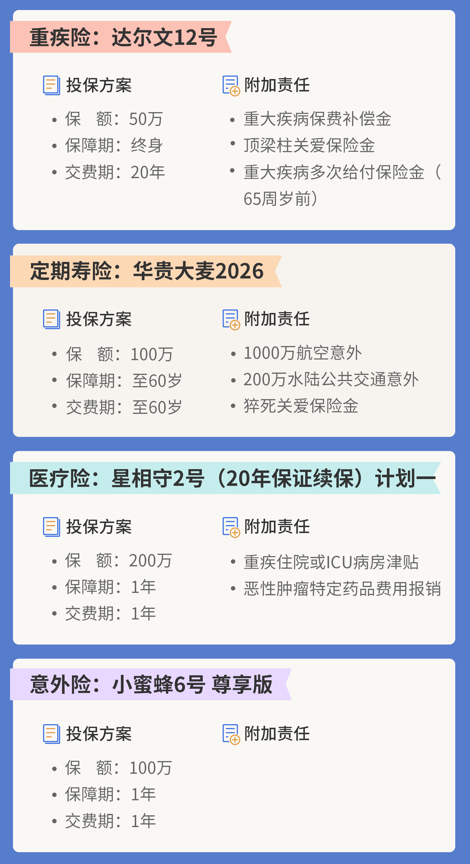 · 百万医疗险:因为健康原因,常规百万医疗险可能没法投保,替换成了不需要做健康告知的产品。