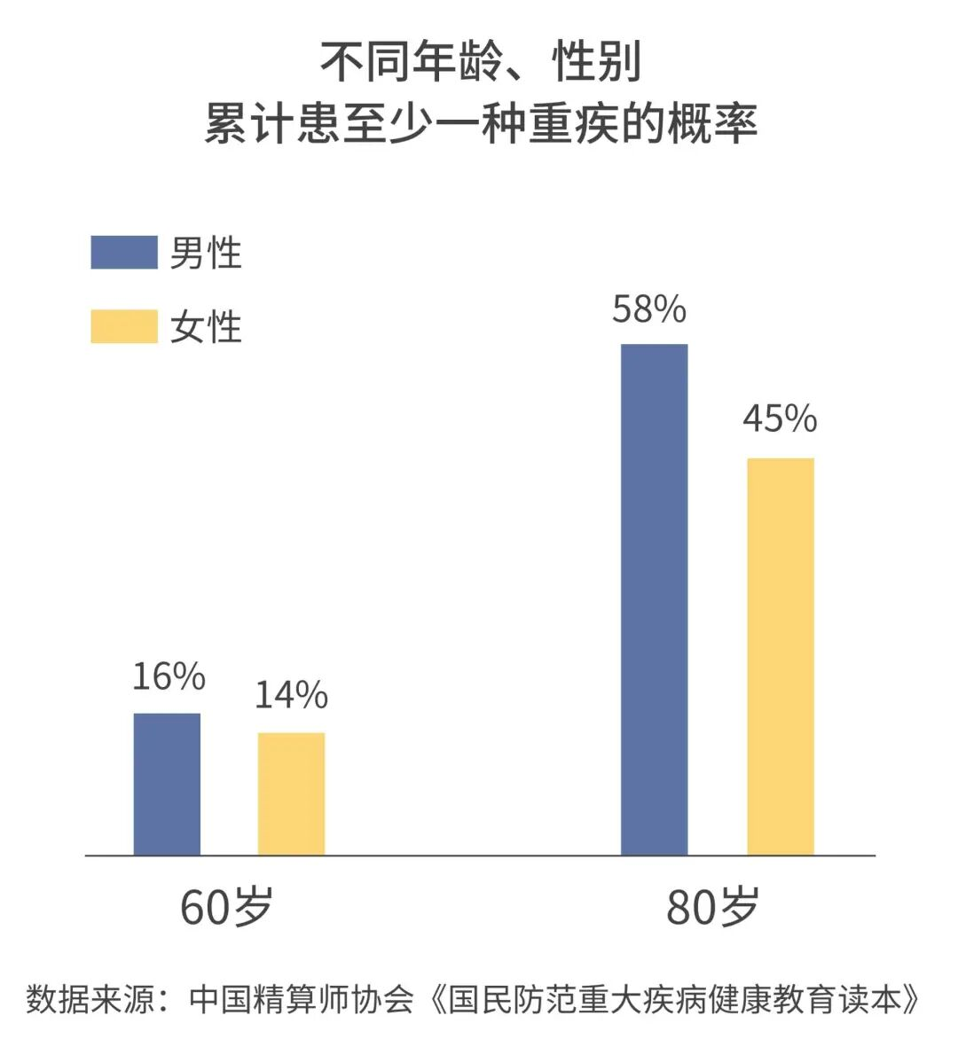 大家可能想不到,平均来看,一个男性,从出生到活到80岁,这段时间里累计得至少一种重疾的概率,高达58%。
