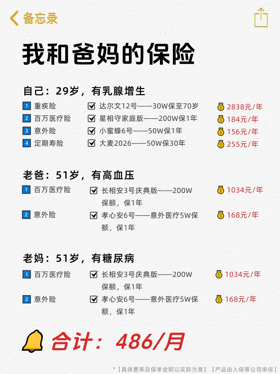 按上面的思路买,自己和爸妈的保险,一年5837元,平均每月486,性价比绝了!