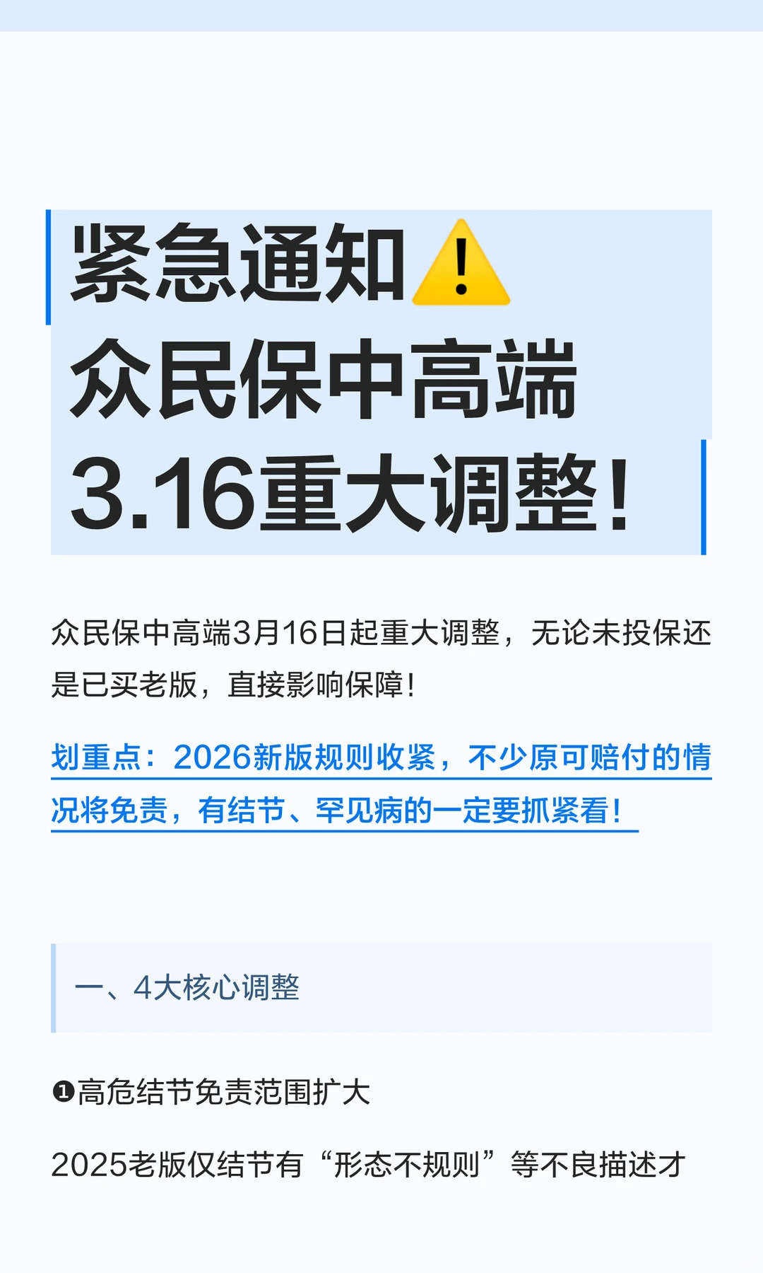 众民保中高端3月16日起重大调整,无论未投保还是已买老版,直接影响保障!