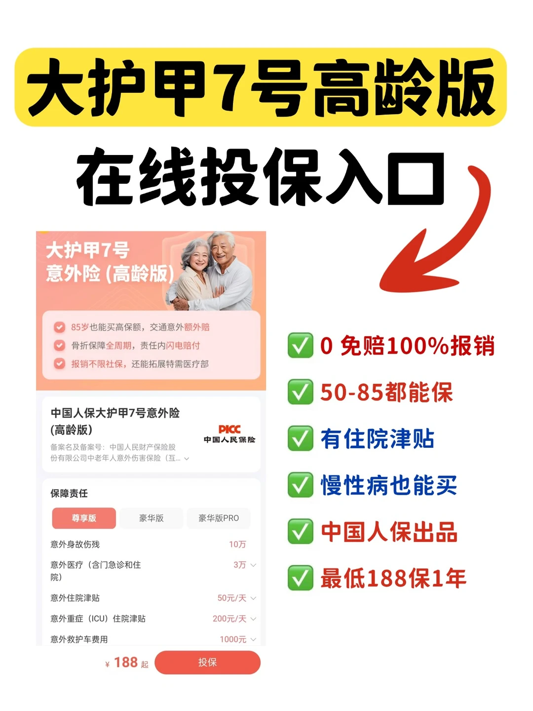 性价比拉满:50-75岁选尊享版每年188元起,76-85岁也能投,一天不到1块钱,就能享10万意外身故/伤残+3万意外医疗,家庭投保还有优惠