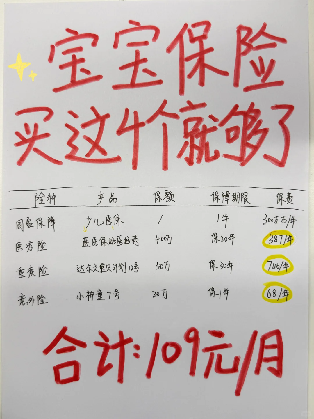 按上面攻略配,每月一两百就能给宝宝全面的保障,花钱不多,安心不少!