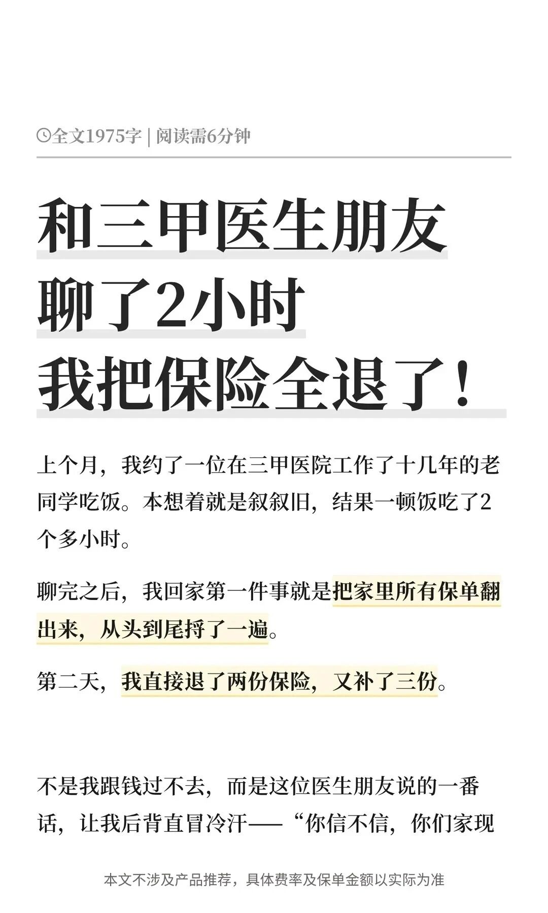 上个月和三甲医院工作的老同学吃了顿饭,聊了2小时,回家直接退了两份保单...